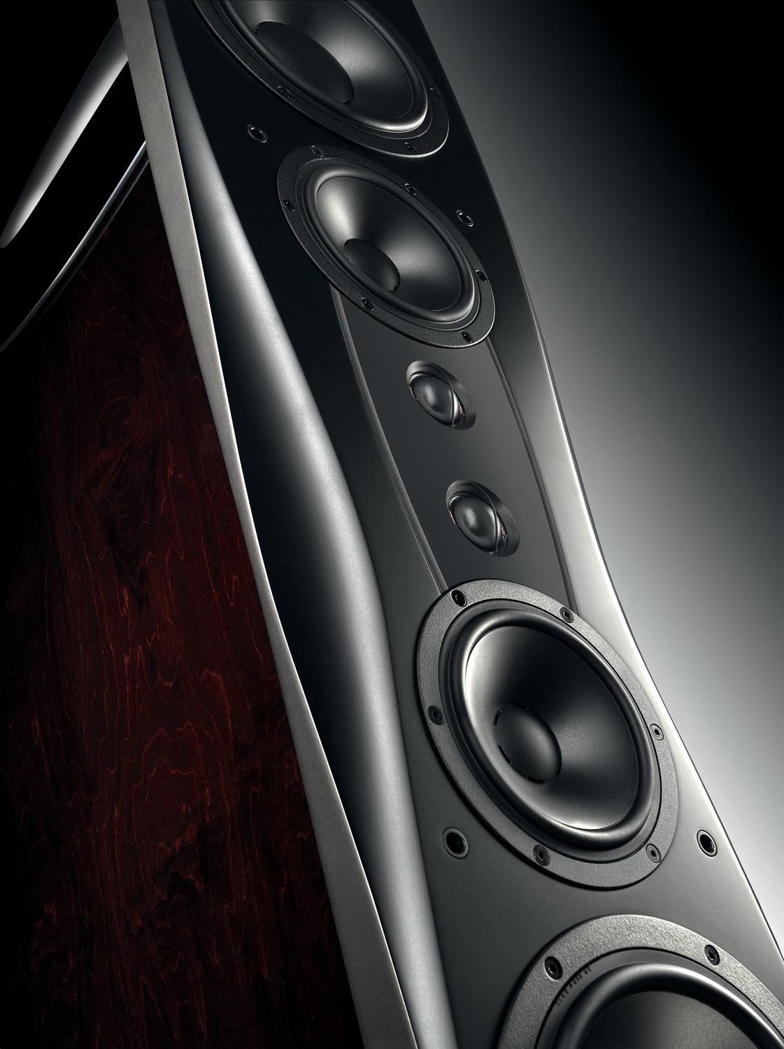 173 cm wysokości. Legendarne Esotary2, uzupełnione średniotonowymi „piętnastkami” i mocnymi basowymi „dwudziestkami” – pełna symetria, po dwie sztuki na kanał! Dzięki takiej konfiguracji Confidence C4 Platinum wydatnie redukują odbicia w pomieszczeniu. To autorski patent Dynaudio: DDC, czyli kontrolowana kierunkowość promieniowania. W połączeniu z rozbudowaną topologią filtrów, obniża ona energię rozpraszaną w kierunku podłogi i sufitu o 75 %, dzięki czemu zestaw głośników może w pełni oddać wrażenie obecności na muzycznym spektaklu, eliminując nadmierny pogłos pomieszczenia, w którym słuchamy. Zwrotnice z filtrami pierwszego rzędu kształtują pasmo obydwu dwóch symetrycznych sekcji w nieco inny sposób, dopasowując całość idealnie do siebie pod względem kierunku rozchodzenia się dźwięku. Przepiękny panel przedni wycinany za pomocą obrabiarek CNC – oprócz tego że jest ozdobą konstrukcji – pełni także rolę bezkompromisowej odgrody akustycznej, w której spoczywają głośniki. Dodatkowo, jego kształt wspomaga działanie układu DDC.